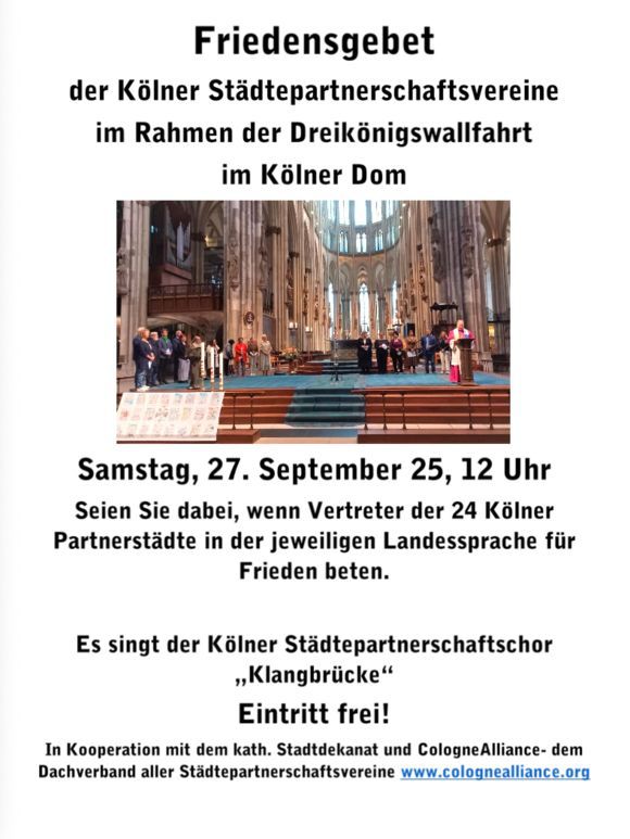 Am Sa, 27. 9., 12 Uhr ist wieder das Friedensgebet im Rahmen der Dreikönigswallfahrt- wenn et bedde sich lohne däät…